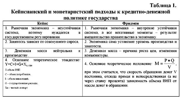 Под монетаризмом понимают общетеоретический подход, признающий исключительную важность денег в экономике и отдающий приоритет особому типу кредитно-денежной политике – прямому регулированию темпов роста денежной массы – в противоположность иным методам воздействия, прежде всего фискальной, а также денежно- кредитной политике, но воздействующей на экономику через процентные ставки.
