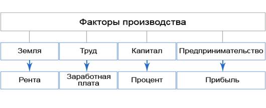 Факторами производства владеют частные лица, компании или государство. Каждый фактор участвует в создании различных товаров и услуг и приносит собственнику этого фактора соответствующий доход. Заработная плата представляет собой вознаграждение за труд, владельцы капитала получают процент, собственники земли – ренту, а предприниматели – прибыль. Схема иллюстрирует образование доходов, создаваемых различными факторами.