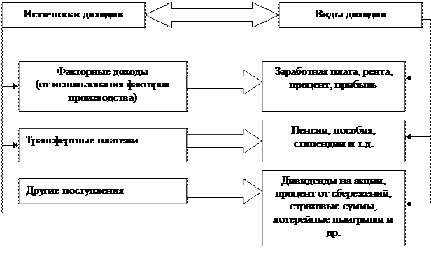 Доходы определяют наши возможности в питании и одежде, в получении образования и медицинских услуг; возможности посещать театры и приобретать книги, активно путешествовать по миру и т.д. Доходы населения подразделяются на денежные, натуральные, номинальные, располагаемые, реальные.
