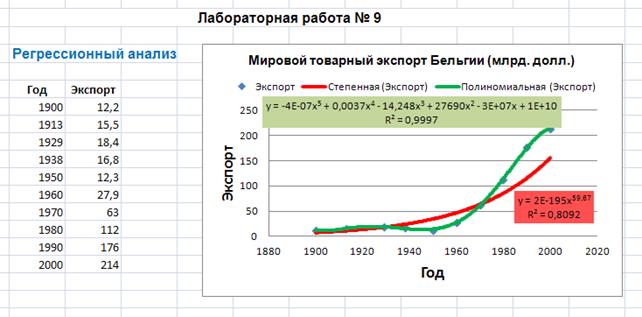 Рис. 1. Пример (не образец!) построения линии и уравнения регрессии (степенная и полиномиальная аппроксимация данных)