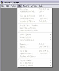 Раздел главного меню программы Clip открывает следующие команды (все субменю приведенных ниже команд могет быть получено более простым путем, если вы щелкните правой кнопкой мыши в окне любого клипа, который находится на TimeLine):