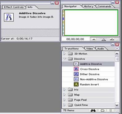 Когда ваш проект становится объемным, а вам требуется передвигаться по нему – используется Навигатор. Вы легко можете менять масштаб изображения с помощью этого удобного приспособления, если нужно укрупнено просмотреть переходы. Для передвижения по TimeLine ухватите мышью, очерченную зеленым прямоугольником зону монтажной программы в рабочем окне Навигатора и двигайте ее в любом направлении. Этот зеленый прямоугольник отражает видимую область программы в окне TimeLine. Чтобы увеличить масштаб изображения клипов на TimeLine с помощью Навигатора в регулируемом режиме, двигайте треугольный ползунок регулятора вправо. При этом зеленый прямоугольник наблюдаемой области сузится, и клипы будут демонстрироваться более подробно. Для уменьшения масштаба – переместите ползунок влево. При захвате мышью Линии редактирования, которая в Навигаторе изображена красным цветом, вы можете переместить ее, удерживая при этом Shift клавиатуры. Можно также сместить эту линию известными нам командами – стрелка влево, стрелка вправо. Для точного установления ее местоположения, обнулите мышью TimeCode в левом нижнем углу окна Навигатора и напечатайте требуемый – Edits Line переместится в указанную вами точку. Info, в котором вы можете просмотреть общую информацию по выделенному вами клипу. Окно Навигатора может быть превращено в окно Commands, а так же в закладку History, которая отображает список изменений производимых в проекте и позволяет сделать откат на несколько шагов назад сразу. Число откатов, которые помнит программа, задается в общих настройках программы.