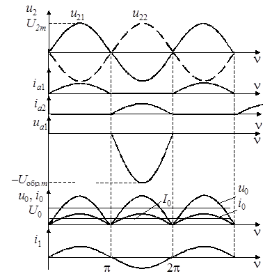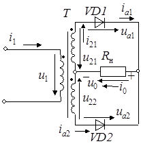 На интервале времени от n= 0 до n= p вывод вторичной обмотки трансформатора, помеченный точкой, положителен по отношению к средней точке. Диод VD1 открыт, и к сопротивлению нагрузки приложено фазовое напряжение. К диоду VD2 на этом интервале приложено обратное напряжение, и он закрыт. В следующий полупериод полярность напряжения на обмотках трансформатора меняется на противоположную, проводящим становится диод VD2, а диод VD1 закрывается.