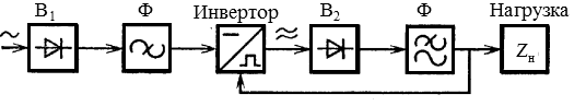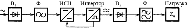 В настоящее время широко применяются импульсные ИВЭП - ИВЭП с бестрансформаторным входом и звеном повышенной частоты (рис. 1.4). Как правило, они являются стабилизирующими ИВЭП, причем применяется импульсный стабилизатор напряжения (ИСН). Регулирование и трансформация напряжения осуществляются на повышенной частоте - частоте преобразования инвертора (10 кГц и выше), при этом изоляция нагрузки от инвертора обеспечивается трансформатором инвертора.
