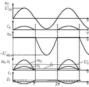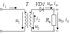 Рассмотрим работу однополупериодной однофазной схемы выпрямления при работе на активную нагрузку R н(рис. 3.4) [1, 2]. В течение положительной полуволны напряжения вторичной обмотки к вентилю (диоду) приложено положительное напряжение и диод беспрепятственно пропускает ток. При этом падение напряжения на нем равно нулю, а напряжение на нагрузке равно вторичному напряжению. При наступлении второй половины периода, когда вторичное напряжение изменяет свой знак, диод закрыт и не пропускает ток. Поэтому напряжение на нагрузке отсутствует, а к диоду приложено обратное напряжение.