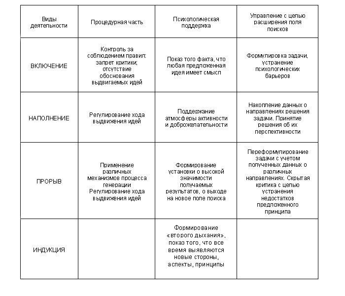Общей целью ведущего, реализуемой на всех фазах, является введение генераторов в состояние максимальной творческой раскованности, душевного подъема, концентрации мысли на рассматриваемом объекте. Ведущему необходимо обеспечить активную работу подсознания генератора, фиксировать совместно с ним все идеи, возникающие во время размышления вслух. Однако если генератор может в данный момент творить свободно, то ведущий проводит еще и большую аналитическую, управленческую работу. Анализ функций, выполняемых ведущим на этапе генерации, показан в табл. 3. Разберем деятельность ведущего 'более подробно.