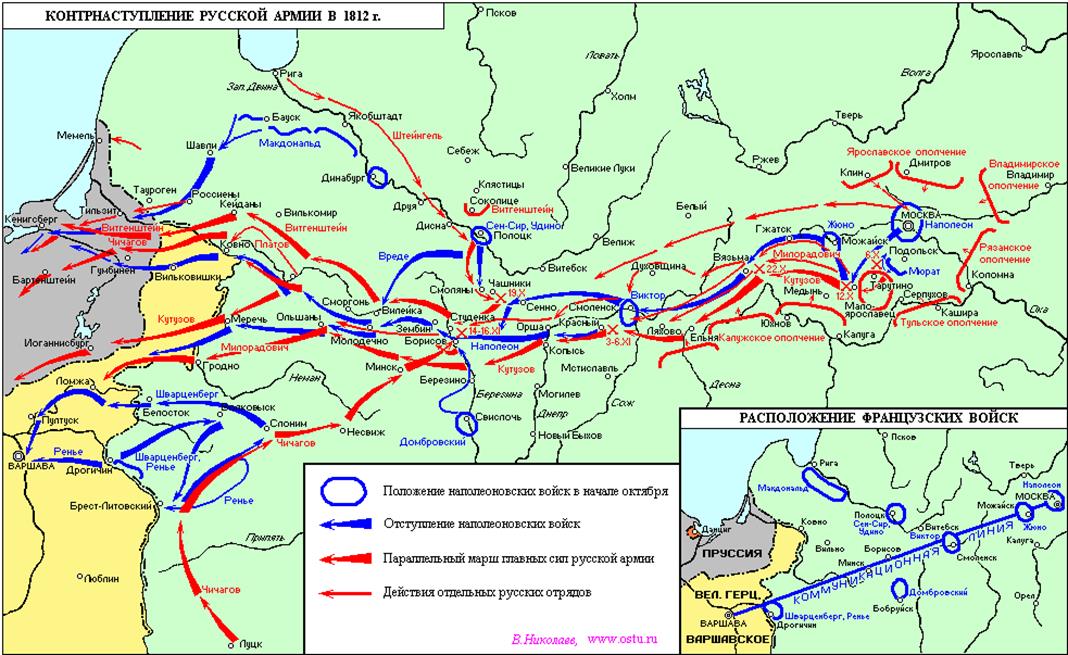 В ходе отступления французы понесли потери в сражениях при Вязьме и Красном, но больше всего — от начавшегося голода. С трудом Наполеону удалось избежать ловушки и 14 — 16 ноября прорваться через реку Березину, потеряв при переправе до 30 тыс. человек. 23 ноября император передал командование маршалу И.Мюрату и отправился в Париж.