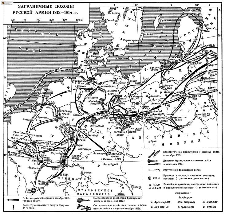 Заграничные походы русской армии. В январе 1813 г. русские войска перешли границу. Был подписан договор о совместных действиях России и Пруссии (Шестая антифранцузская коалиция, позже к ней присоединилась Австрия). Союзники подошли к Эльбе. Здесь М. И. Кутузов простудился, заболел и 16 апреля 1813 г. скончался.