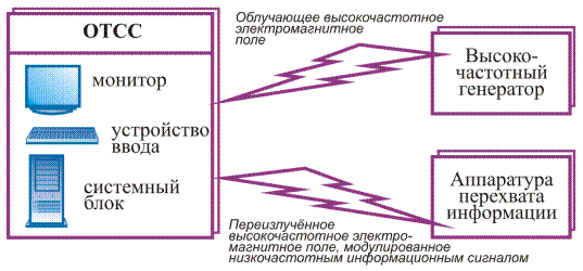 Могут использоваться и параметрические каналы утечки информации, формируемые в результате высокочастотного облучения элементов технических средств обработки информации, в которых проводится обработка информативных сигналов, и приема переизлученного сигнала средствами, аналогичными средствам перехвата ПЭМИН (рис.1).