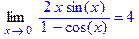 > Limit((2*x*sin(x))/(1-cos(x)),x=0)=limit((2*x*sin(x))/(1-cos(x)),x=0);