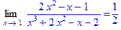 > Limit((2*x^2-x-1)/(x^3+2*x^2-x-2),x=1)=limit((2*x^2-x-1)/(x^3+2*x^2-x-2),x=1);