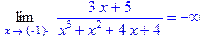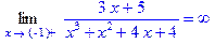 > Limit((3*x+5)/(x^3+x^2+4*x+4),x=-1+0,right)=limit((3*x+5)/(x^3+x^2+4*x+4),x=-1+0,right);