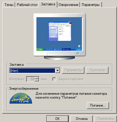 · установка в поле Интервал требуемого времени бездействия пользователя, по истечении которого будет активизироваться хранитель экрана;