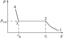 Рассмотрим процесс сжатия вещества при постоянной температуре (рис.5.1). Предполагаем, что сначала вещество газообразное. При уменьшении объема давление газа будет расти (участок 1 - 2 рис.5.1). По достижению объема Vг (точка 2) давление перестает изменяться, а вещество перестает быть однородной - часть газа конденсируется в жидкость. Происходит расслоение вещества на две фазы: жидкостную и газообразную. По мере дальнейшего уменьшения объема все большая часть вещества переходит в жидкостную фазу, причем переход осуществляется при постоянном давлении p н.п. (давление насыщенного пара).