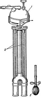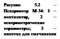 В аспирационном психрометре М-34 (рис. 5.2) ртутные шарики термометров (2) защищены от действия лучистой энергии футлярами с двойными стенками. Прибор снабжен вентилятором (1), обеспечивающим постоянную скорость движения воздуха у ртутных шариков термометров (2 м/сек). Перед определением ткань, покрывающую ртутный шарик смоченного термометра, смачивают дистиллированной водой. Избыток воды удаляют встряхиванием, после чего включают вентилятор и прибор помещают в точке, где необходимо произвести определение. При температуре воздуха 15–20° отсчет показаний термометра производят через 4 мин. При температурах ниже 15° длительность протягивания воздуха увеличивают до 20–30 мин. (до тех пор пока не установится постоянная температура смоченного термометра). Расчет результатов производят по специальной таблице 5.2.