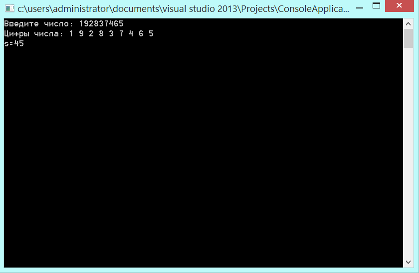 | #include "stdafx.h" #include "conio.h" #include <iostream> int _tmain(int argc, _TCHAR* argv[]) { setlocale(LC_ALL, "Russian"); int s = 0, i; char a[1000]; printf("Введите число: "); gets_s(a); printf("Цифры числа: "); for (i = 0; i < strlen(a); i++) { printf("%c ", a[i]); s = s + (a[i] - '0'); } printf("\ns=%d ", s); _getch(); return 0; } |