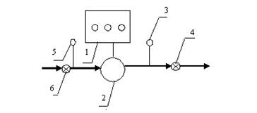 Рис.1. Блок- схема шестеренного насоса. 1.- электрощит насоса. 2-шестеренный насос.3-манометр.4-нагнетательный клапан.5-ваккуметр.6-всасывающий клапан.