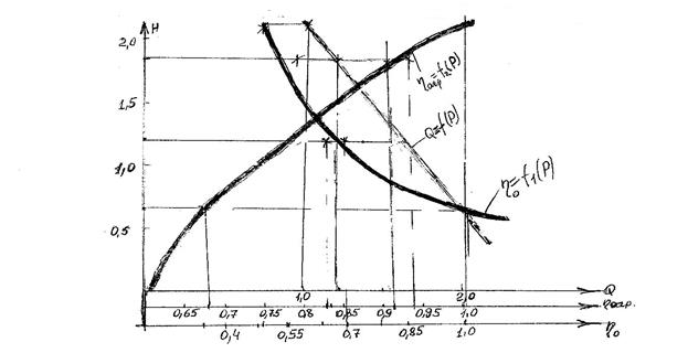 подача насоса в режимах 2,3,4. В режиме -1.КПД будет равен единице при полном открытом клапане. Все данные вносим в таблицу и начинаем строить характеристики: Q=f(P),ηo=f1(P),ηагр=f2(P).
