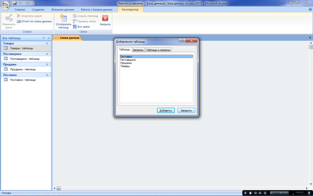Поочерёдно выберите название таблиц и нажмите кнопку Добавить. После добавления всех таблиц закройте окно. Теперь перед вами окно, как на рисунке 6.