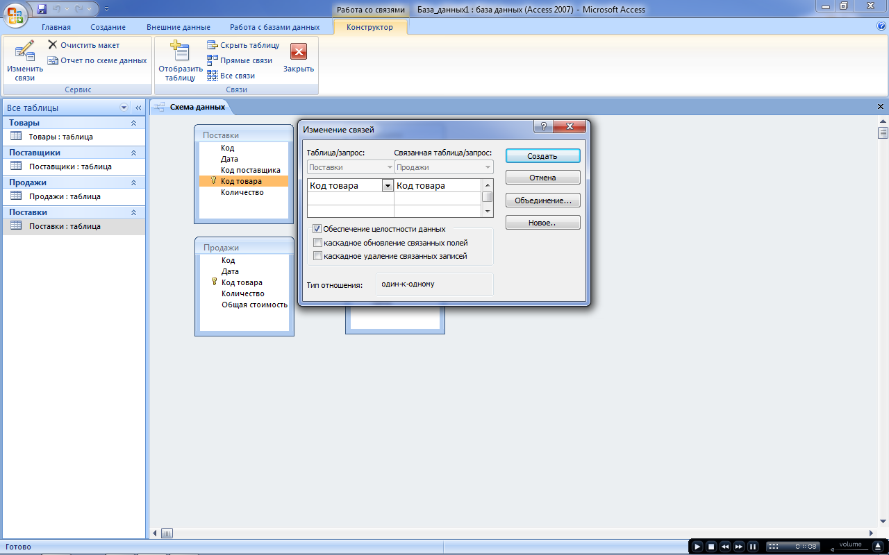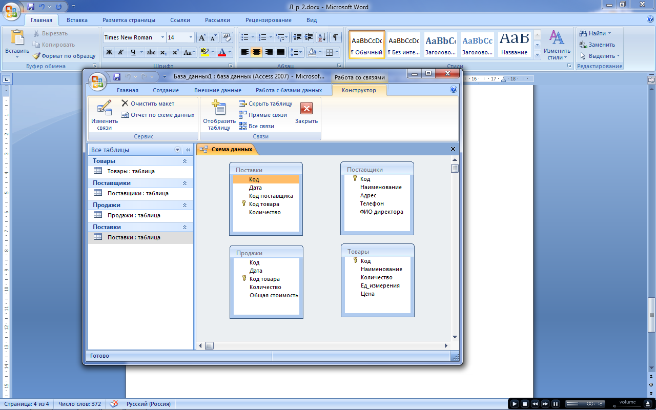 2. создайте схему данных, установите связи между таблицами, определите тип отношений;