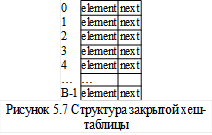 При закрытом хешировании в таблице сегментов хранятся элементы словаря, а не заголовки списков. В каждом сегменте может храниться только один элемент словаря. При таком хешировании применяется методика повторного хеширования. Сформулируем его принцип. Если возникает попытка поместить элемент x в сегмент с номером h(x), который уже занят другим элементом (коллизия), то выбирается последовательность других номеров сегментов h1(x), h2(x),..., куда можно поместить элемент x. Местоположения последовательно проверяются, пока не будет найдено свободное. Если свободных мест нет, то таблица уже заполнена, и элемент x вставить нельзя. Структура закрытой хеш-таблицы выполняется с использованием массива большого размера (рис. 5.7), в котором элементы расположены в разнобой. Поиск элемента в хеш-таблице напоминает последовательный поиск среди расположенных в разнобой элементов массива, порядок которых устанавливается полем next. Это поле хранит индекс следующего элемента таблицы.