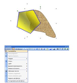 Объединение (или группировка) автофигур - это последний этап создания рисунка, состоящего из нескольких автофигур. Сначала следует изобразить отдельные детали рисунка в виде автофигур. Затем произвести их наложение и объединение в группу. Группу автофигур можно обрабатывать как единое целое, т.е. как обычный графический объект. Особенно это удобно, если требуется изменить размеры, или переместить или скопировать весь рисунок сразу