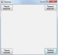 7. Запустите проект. Форма появится в центре экрана монитора. Последовательно щелкните по всем кнопкам, они переместятся в углы формы.