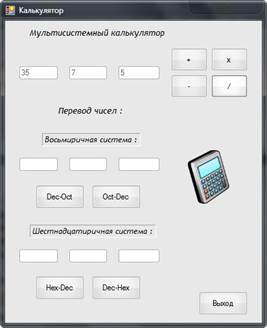Запустить проект на выполнение. Ввести числа в два первых текстовых поля десятичной системы. Щелкнуть по кнопке «+», а затем Dec-Oct. Будет выполнено сложение, десятичных чисел и их перевод в восьмеричную систему.