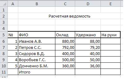 • Щелкнем ячейку D5 и введем — «Удержано».