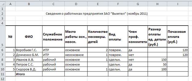14 Создайте в нем следующую таблицу на Листе 1 (фамилии работников скопируйте из файла Таблица3):