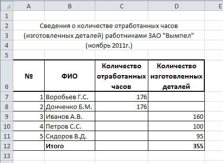 Для подсчета общего количества изготовленных деталей установите курсор в ячейку D12 и введите формулу =СУММ(D9:D11).