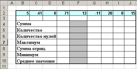4. В ячейках В2:J2 дана последовательность чисел. Требуется найти наибольшее, наименьшее, вычислить сумму чисел и среднее значение, посчитать общее количество чисел, количество нулевых, и сумму отрицательных.