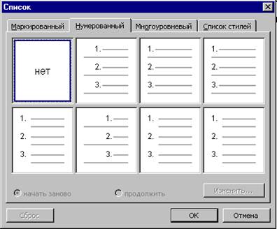 Для создания простого нумерованного или маркированного списка следует выбрать команду Формат | Список | вкладка Маркированный список (либо Нумерованный список) и в открывшемся диалоговом окне указать необходимый тип списка.
