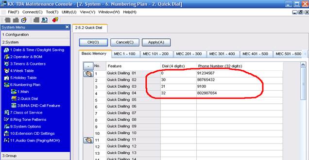 Назначение нумерационного плана, работа с Quick Dialling и Speed Dialling телефонной сети УАТС Panasonic KX-TDA100
