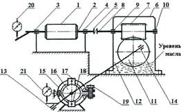 1 – электродвигатель типа А02-22 4/2; 2 – вал электродвигателя; 3, 4 – подшипниковые опоры вала электродвигателя; 5 – муфта; 6 – червячный редуктор; 7 – червяк; 8 – вал червяка; 9,10 – подшипниковые опоры вала червяка; 11 – червячное колесо; 12 – вал червячного колеса; 13,14 – подшипниковые опоры вала червячного колеса; 15 – двухколодочный тормоз; 16 – тормозной шкив; 17,18 – тормозные колодки; 19 – регулировочный винт тормоза; 20, 21 – часовые индикаторы для измерения вращающих моментов на входном и выходном валах установки.