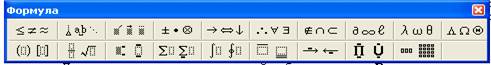 и вводя переменные и числа с клавиатуры. Верхняя строка панели инструментов Формула содержит более 150 математических символов. Нижняя строка используется для выбора разнообразных шаблонов, предназначенных для построения дробей, интегралов, сумм и других сложных выражений.