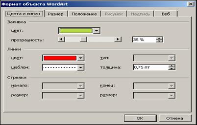 Для форматирования объекта используется окно Формат объекта WordArt, которое вызывается инструментом