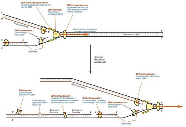 Далее описан синтез отстающей цепи дочерней ДНК.