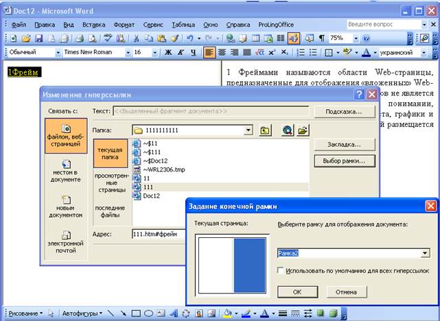 9. В правой рамке для каждого термина настроить гиперссылку для перехода к соответствующему определению. (вставка – гиперссылка - закладка), указать имя рамки в которой будет отображаться результат (См рис 3).