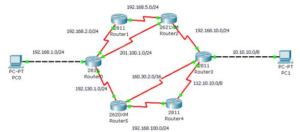 1 На рисунке 1 приведена схема сети. Откройте файл к лабораторной работе или соберите данную схему сети самостоятельно в Cisco packet tracer. Задайте всем устройствам параметры IP. Затем настройте маршрутизацию OSPF. IP-адреса использовать по вариантам, сморите в таблицах 1 и 2, другие оставьте другие без изменения (201.100.1.0, 160.30.2.0, 112.10.10.0, 10.10.10.0).