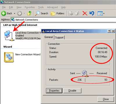 В появившемся окне выбираем нужный сетевой адаптер (обычно он там один). Новое окно сообщает нам довольно много информации. Во-первых, статус соединения (в данном случае – Connected, т.е. физическое подключение есть) и его скорость (100 Мбит). А так же количество посланных и принятых пакетов. Если кол-во принимаемых пакетов равно нулю, а в сети находится более одного компьютера (включенными), то это, возможно, указывает на неисправность нашей сетевой карты или порта коммутатора (если компьютер подключен к нему). Так же возможна неисправность самого кабеля.