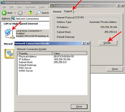 Выбрав закладку Support, можно узнать текущий IP адрес и маску подсети, назначенные сетевой карте. По умолчанию, ОС Windows дают адаптерам IP адреса их диапазона 169.254.0.0 -- 169.254.255.254 с маской подсети 255.255.0.0. Цифры IP адреса, которые совпадают по позициям с ненулевыми цифрами маски подсети, у всех компьютерах должны быть одинаковыми.