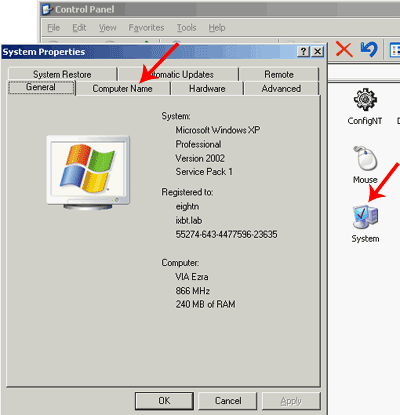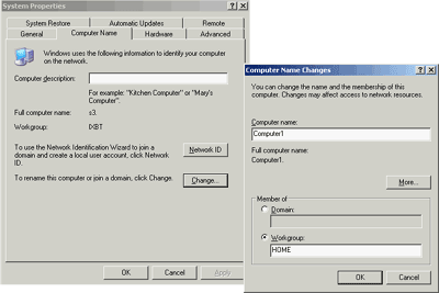 Кроме сетевых адресов, всем компьютерам нужно задать одинаковое имя рабочей группы. Это настраивается в настройках системы (System Properties). Туда можно попасть через панель управления (System –> Computer Name).