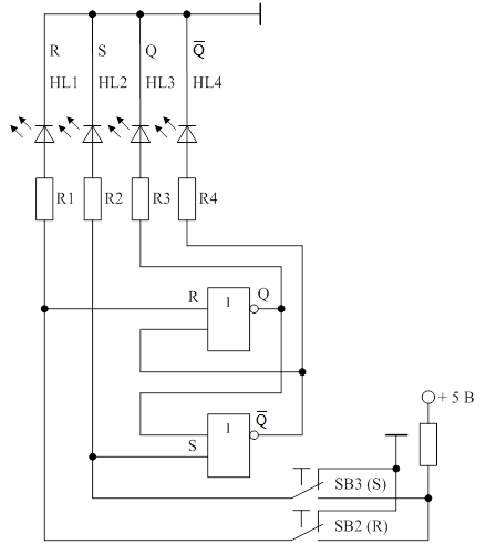 3.2 Изучить принципиальную электрическую схему контроля работы RS-триггера (рисунок 1), назначение органов управления и элементов индикации. Следует помнить, что сигнал на вход S подается с помощью кнопки SB3, а на вход R – с помощью кнопки SB2. Активный высокий уровень сигнала на входах индицируется с помощью светодиодов HL1, HL2. Состояние триггера определяется с помощью светодиода HL3.