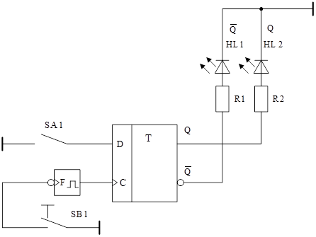 5.2 Изучить принципиальную электрическую схему контроля работы D-триггера (рисунок 3). Уровень напряжения на входе D не индицируется, а определяется положением тумблера SA1. Состояние триггера определяется с помощью светодиода HL2.