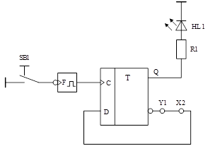 6.2 Изучить принципиальную электрическую схему контроля работы T-триггера (рисунок 4), назначение органов управления и элементов индикации. Соединить перемычкой на плате П2 инверсный выход триггера и вход D (клеммы Y1 и X2).