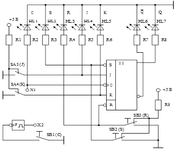 7.2 Изучить схему контроля работы JK-триггера (рисунок 6), назначение органов управления и элементов индикации.