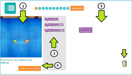 1. Левая часть экрана - это лабиринт, в котором будет работать программа из блоков. Инструкции для каждой головоломки написаны под лабиринтом