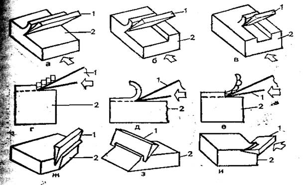 а—открытое; б — полузакрытое; в — закрытое; г — в торец; 9- вдоль волокон; е — поперек волокон; ж — торцово-поперечное; з - торцово-продольное; и — продольно-поперечное; 1— резец; 2-древесина.
