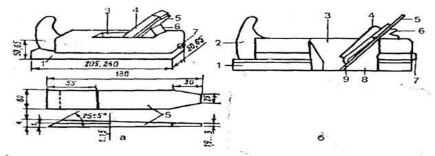 Инструменты для ручного строгания. Рубанок (рис. 3) представляет собой деревянный корпус 1, в который вставлен нож 5, закрепляемый клином 4. Нож 5 вставляют в гнездо (леток) 3 корпуса под углом 45°. В подошве 8 рубанка имеется угловая прорезь— пролет шириной (5.7+0.5—1) мм, через которую за подошву выступает лезвие ножа. С боков летка 3 делают заплечики для опирания клина 4. Для удобного продвижения рубанка по материалу имеется рог 2. Подошва 8 рубанка должна быть гладкой и ровной. В связи с тем, что подошва рубанка работает на истирание, в ней делают вклейку из древесины твердых пород — граба, клена, ясеня, бука и др.
